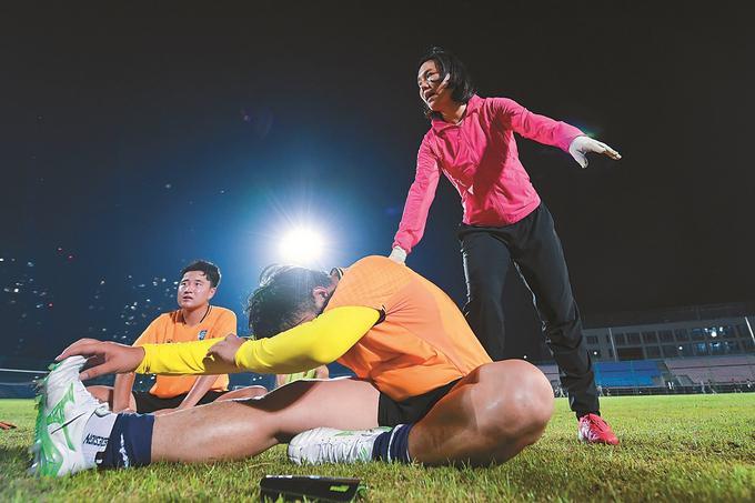 “苏超”绿茵场上,年轻的泰州队挥洒汗水、奋力拼搏。与职业球队不同,泰州队固定集训大多安排在晚上,因为白天他们是警察、电信员工、私营企业主、高中学生……只有下班或者放学后才能集中训练。“一个个普通人奔跑的身影,让更多人感受到足球的魅力,体会到足球原来可以如此快乐。”每次集训时,周高萍除了带领队员们系统开展体能储备与战术磨合外,还会复盘过往的比赛、制定相应的应对计划,同时,她会更多地把自己掌握的比赛经验传授给队员们。在她看来,虽然看上去每个队员持球时间不长,但就如同下围棋,其实球场瞬息万变,每个人都要不断地研究策略,把几秒钟内本能的反应练成精确无失误的状态。
